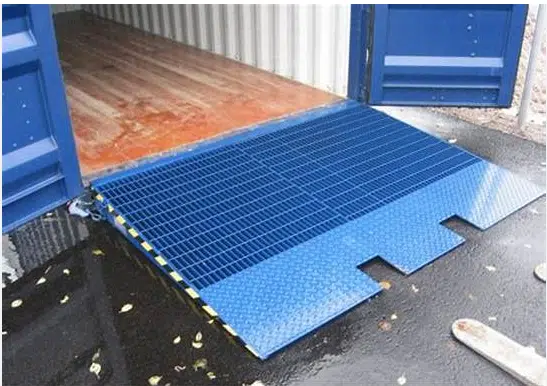 Selvjusterende containerrampe for bruk på bakkeplan. Denne modellen er utstyrt med gaffellommer for enkel flytting og transport. Kapasitet 6500 KG